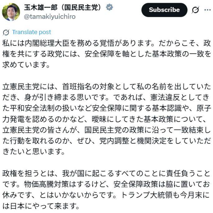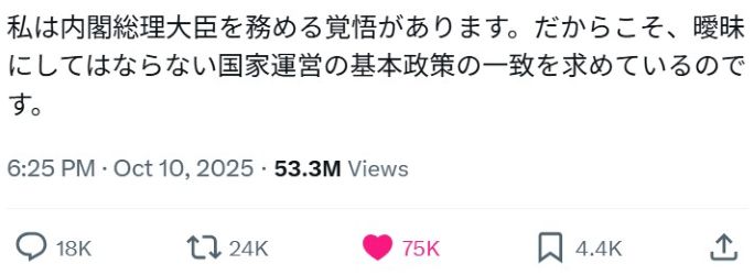 (「玉木雄一郎(国民民主党) X/ツイッター さん 2025/10/10」より)