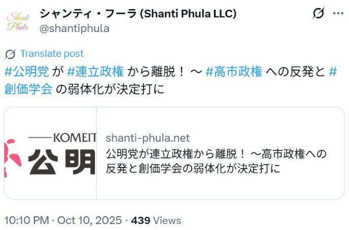 (「シャンティ・フーラ X/ツイッター さん 2025/10/10」より)