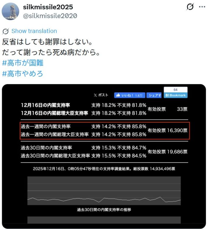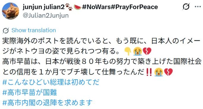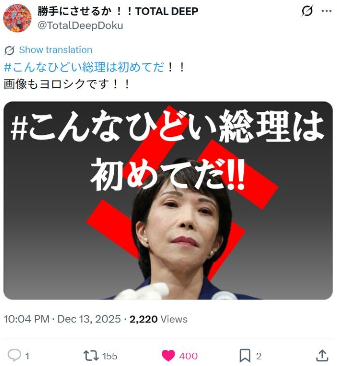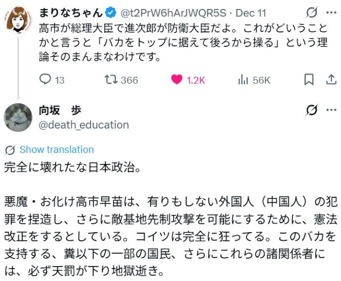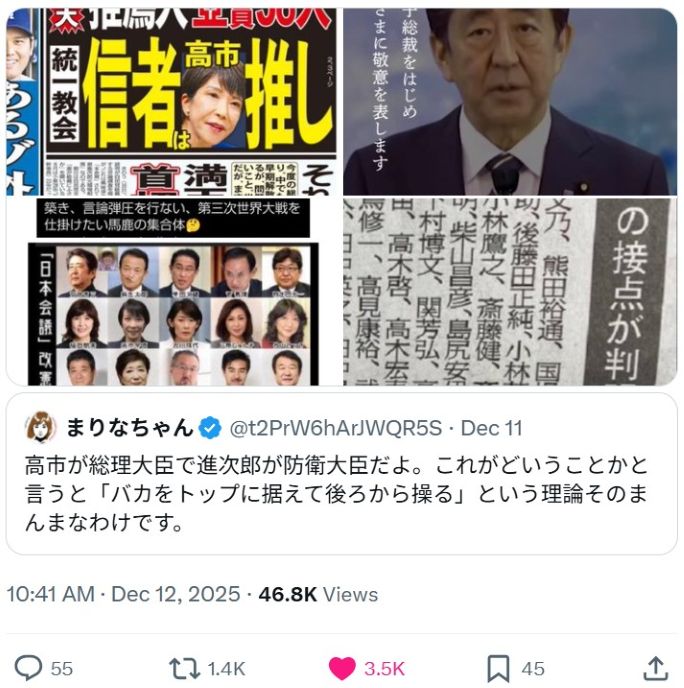 【 時代遅れ 自滅的 偽サッチャー:海外メディアの高市早苗評価/こんなひどい総理は初めてだ 高市やめろ 高市早苗が国難 その金どこから高市早苗:日本国民の評価 】 2025-12-18更新![]() ● タイトル ![]() ◆【ご連絡】・・「カタカナが半角表示」、「画像が非表示」の場合、PC・スマートフォンページが携帯サイト表示に変換されています。通常、携帯サイト表示とはなりません。日本のカバール(闇の勢力)に妨害されているようです。この場合、下記のURLから当該ページを開いていただけますようよろしくお願いいたします。◆ (「Firouzeh ツイッターさん 2021/12/22」より) |