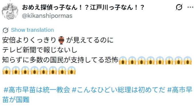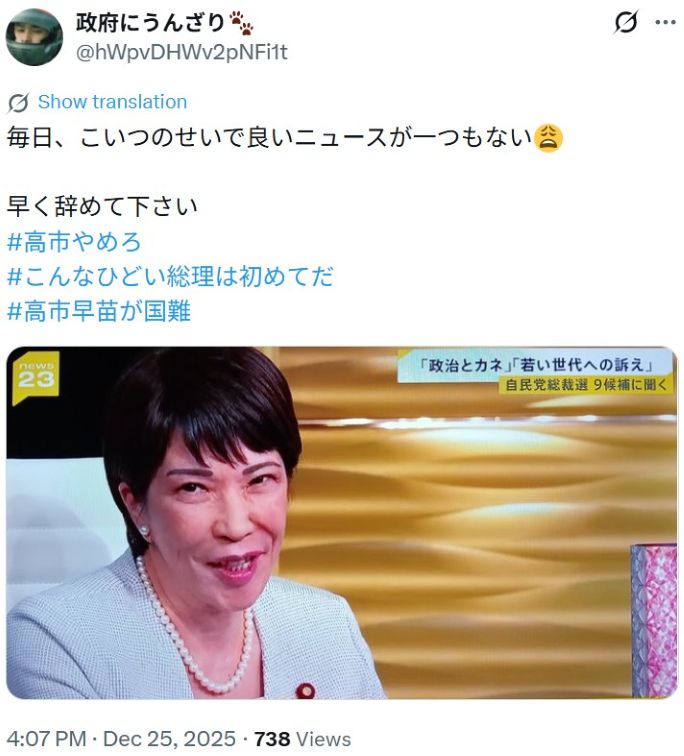 【 高市早苗人間性総括:こんなひどい総理は初めてだ/ウソ、ハッタリ、裏切り、不記載、論点ずらし、何でもやります/統一教会/異常人格無知無能/日本を破壊/経歴詐称 】 2026-01-10![]() ● タイトル ![]() ◆【ご連絡】・・「カタカナが半角表示」、「画像が非表示」の場合、PC・スマートフォンページが携帯サイト表示に変換されています。通常、携帯サイト表示とはなりません。日本のカバール(闇の勢力)に妨害されているようです。この場合、下記のURLから当該ページを開いていただけますようよろしくお願いいたします。◆ (「Firouzeh ツイッターさん 2021/12/22」より) |