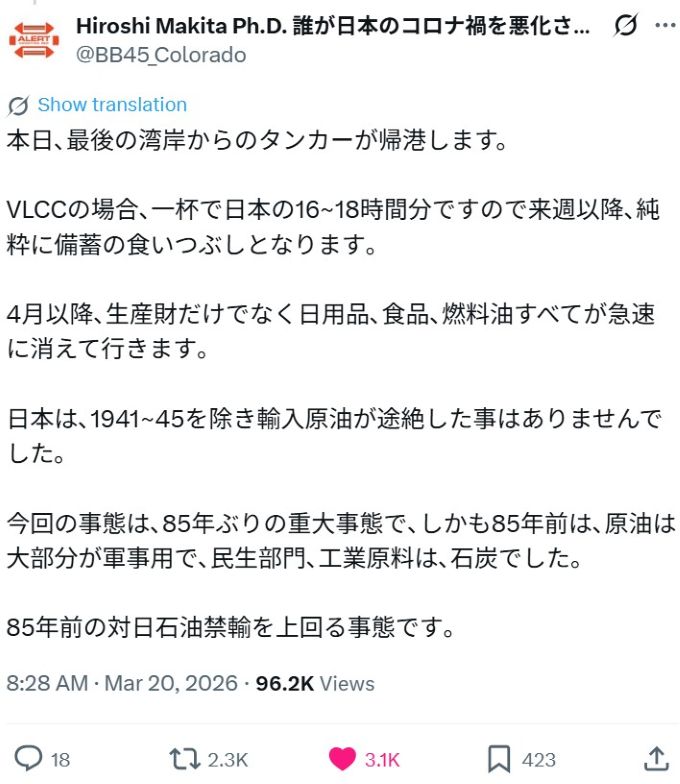 【 異常者高市が日本の原油輸入を85年ぶりに完全停止させた!4月日用品・5月米を除く食糧が消え、6月輪番停電、10月全国的飢餓、11月電力危機、12月餓死・凍死者大発生! 】  2026-03-25更新