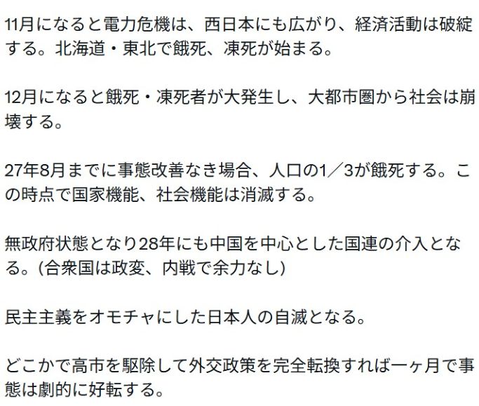 流通が止まる。10月以降、全国的に飢餓。電力危機。12月餓死・凍死者大発生】