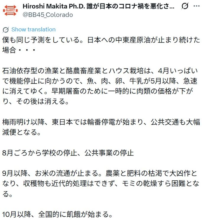■ 【5月以降 魚、肉、卵、牛乳が急速に消えてゆく。輪番停電。9月以降、お米の
