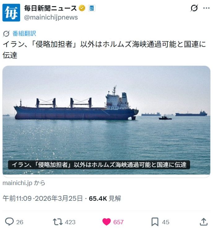 (「毎日新聞ニュース X/ツイッター さん 2026/03/25」より)