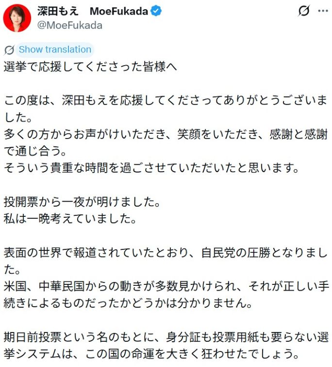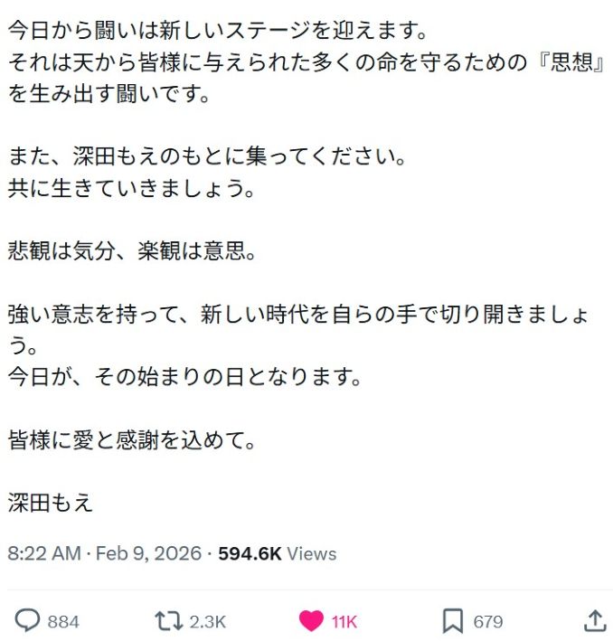 【 戦後の日本は昨日終わりを告げ、戦前の日本が舞い戻る。今日から闘いは新しいステージを迎えます。また深田もえのもとに集ってください。今日がその始まりの日。 】 2026-02-12更新