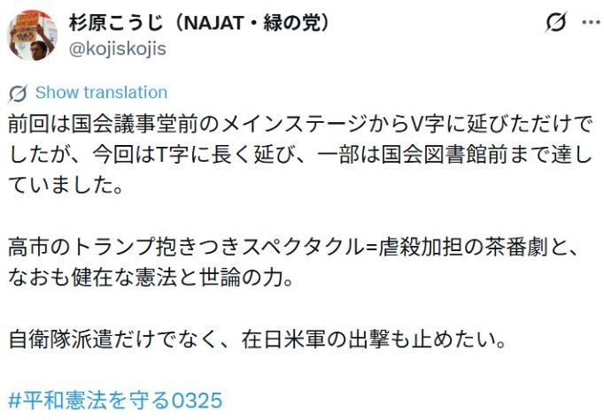 【 「高市やめろ」「9条守れ」「改憲反対」デモ 国民が立ち上がった!全国で連日。3/25国会前24000人。3/29新宿「外交ができる総理に替えろ」4/8「国会前緊急アクション」 】 2026-04-03![]() ● タイトル ![]() ◆【ご連絡】・・「カタカナが半角表示」、「画像が非表示」の場合、PC・スマートフォンページが携帯サイト表示に変換されています。通常、携帯サイト表示とはなりません。日本のカバール(闇の勢力)に妨害されているようです。この場合、下記のURLから当該ページを開いていただけますようよろしくお願いいたします。◆ (「Firouzeh ツイッターさん 2021/12/22」より) |